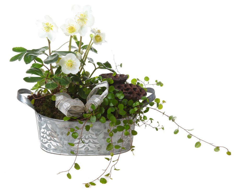 Jouluinen istutus, pääosassa jouluruusu. Astia ja koristeet vaihtelevat saatavuuden mukaan.