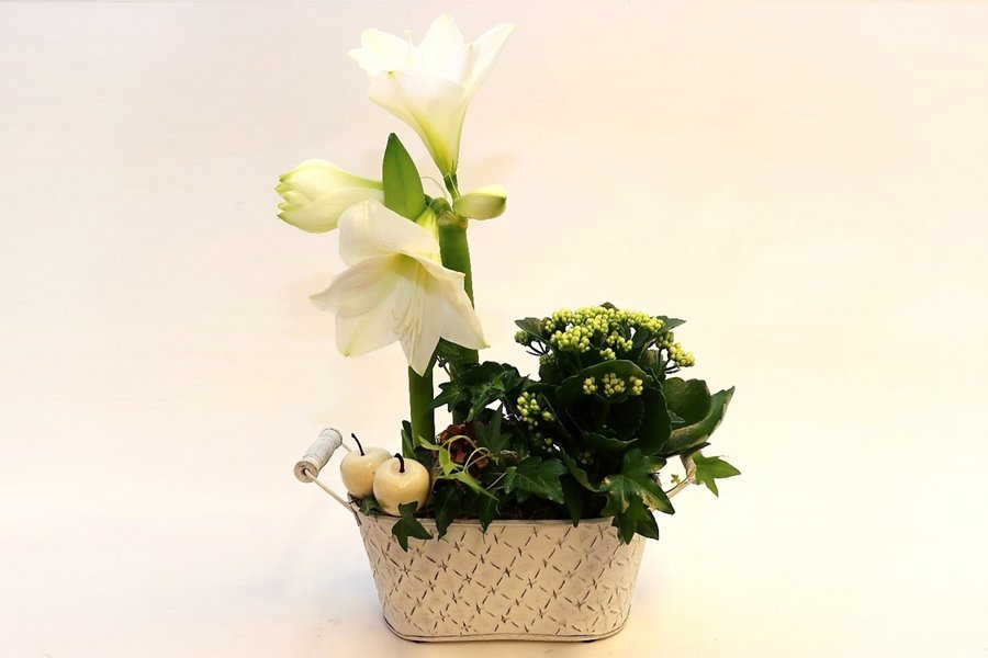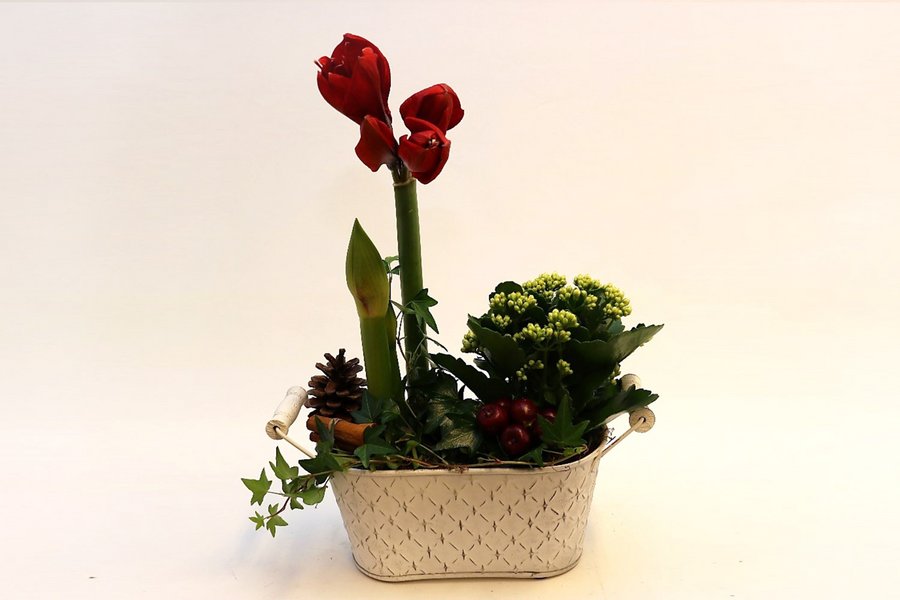 Jouluinen istutus toiveidesi mukaan. Kirjoita lisätietoja -kohtaan toiveesi väristä sekä halutessasi istutukseen käytettävistä kukista. Tähän tuotteeseen ei voi sisällyttää jouluruusua. Astia ja koristeet vaihtelevat.