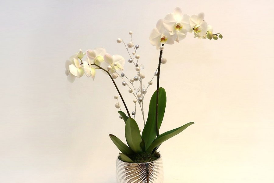 Koristeltu perhoskämmekkä koristeruukussa. Koristeet ja ruukku vaihtelevat.