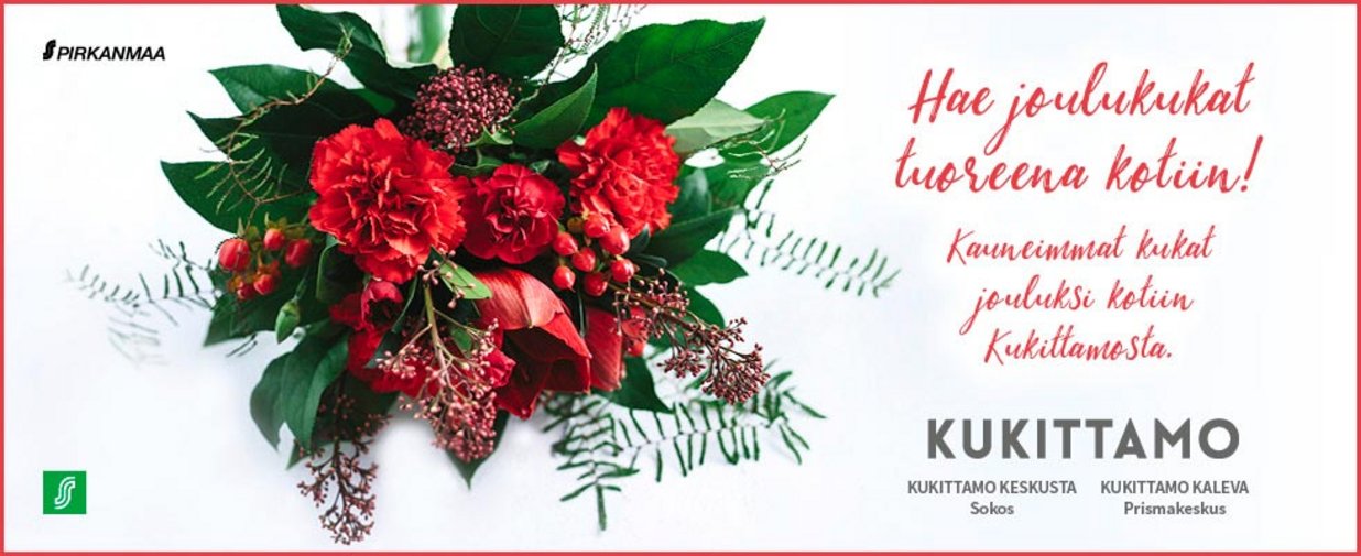 Kukittamon taidolla käsin sidotut kukat loihtivat kauniin ajatuksen näkyväksi vaivattomasti kauppareissusi yhteydessä. Hae kukat tänään tai tilaa ennakkoon verkkokaupasta nouto, lähetys tai kotiinkuljetus. Kukittamo-myymälöissä valikoima on vielä verkkokauppaankin laajempi – tervetuloa myös sunnuntaisin! Myymälöissämme lopetamme sidonnan 15 minuuttia ennen sulkemisaikaa.