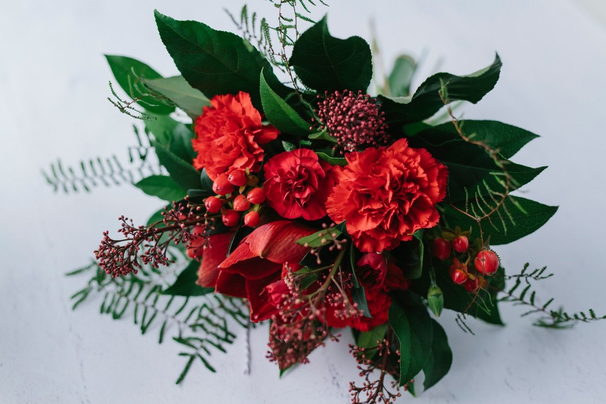 Pyöreä matala kimppu punaista amaryllista ja neilikkaa, skimmiaa ja leikkovihreät.
