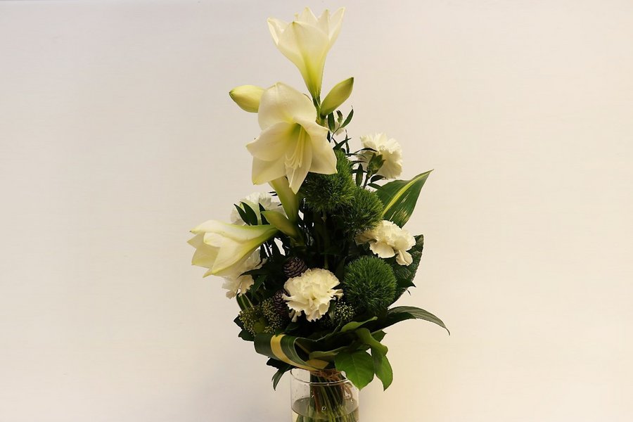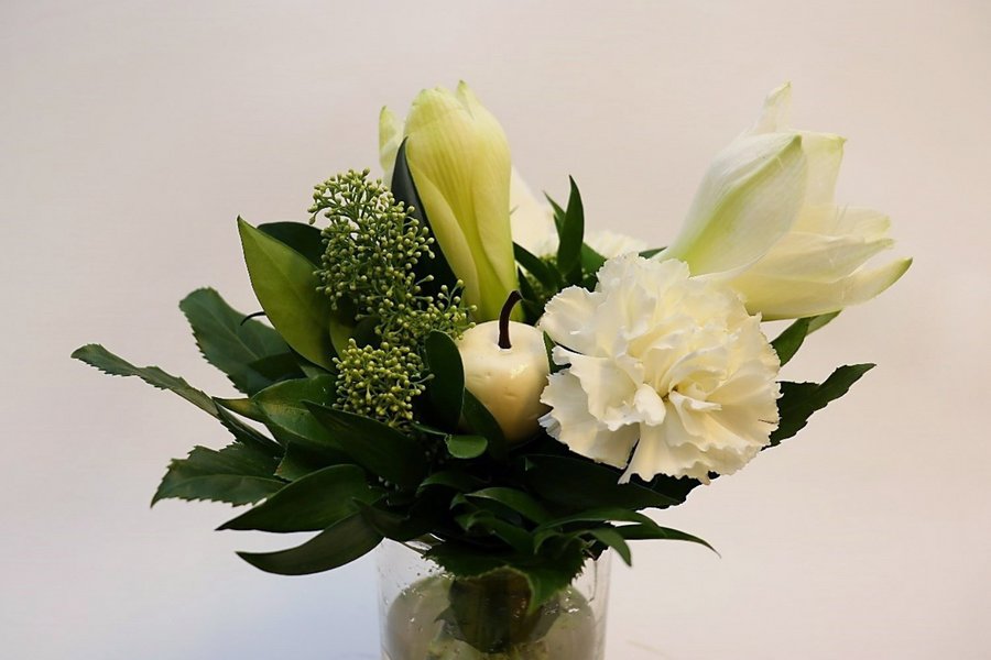Korkea kimppu valkoista amaryllista ja neilikkaa, leikkovihreät.
