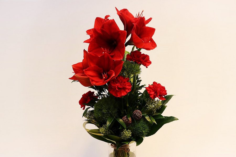 Korkea kimppu punaista amaryllista ja neilikkaa, leikkovihreät.